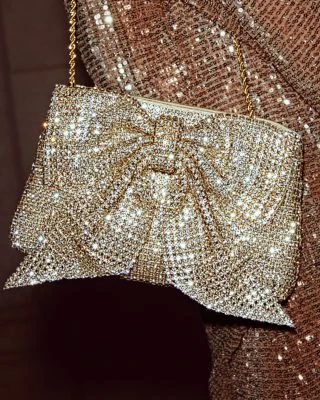 - Gold-tone exterior hardware & allover rhinestone embellishments with bow detail at front