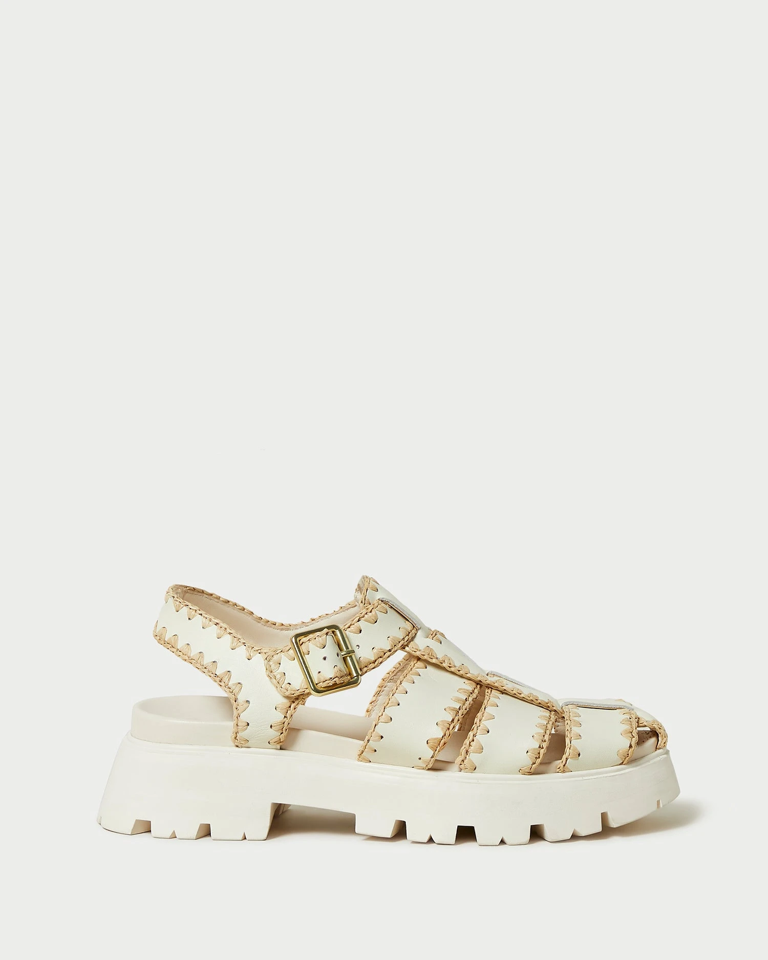 Fisherman-style caged platform sandal in cream vachetta leather with natural raffia whipstitch detailing. Features a round toe and adjustable buckle closure. 1.5-inch platform.