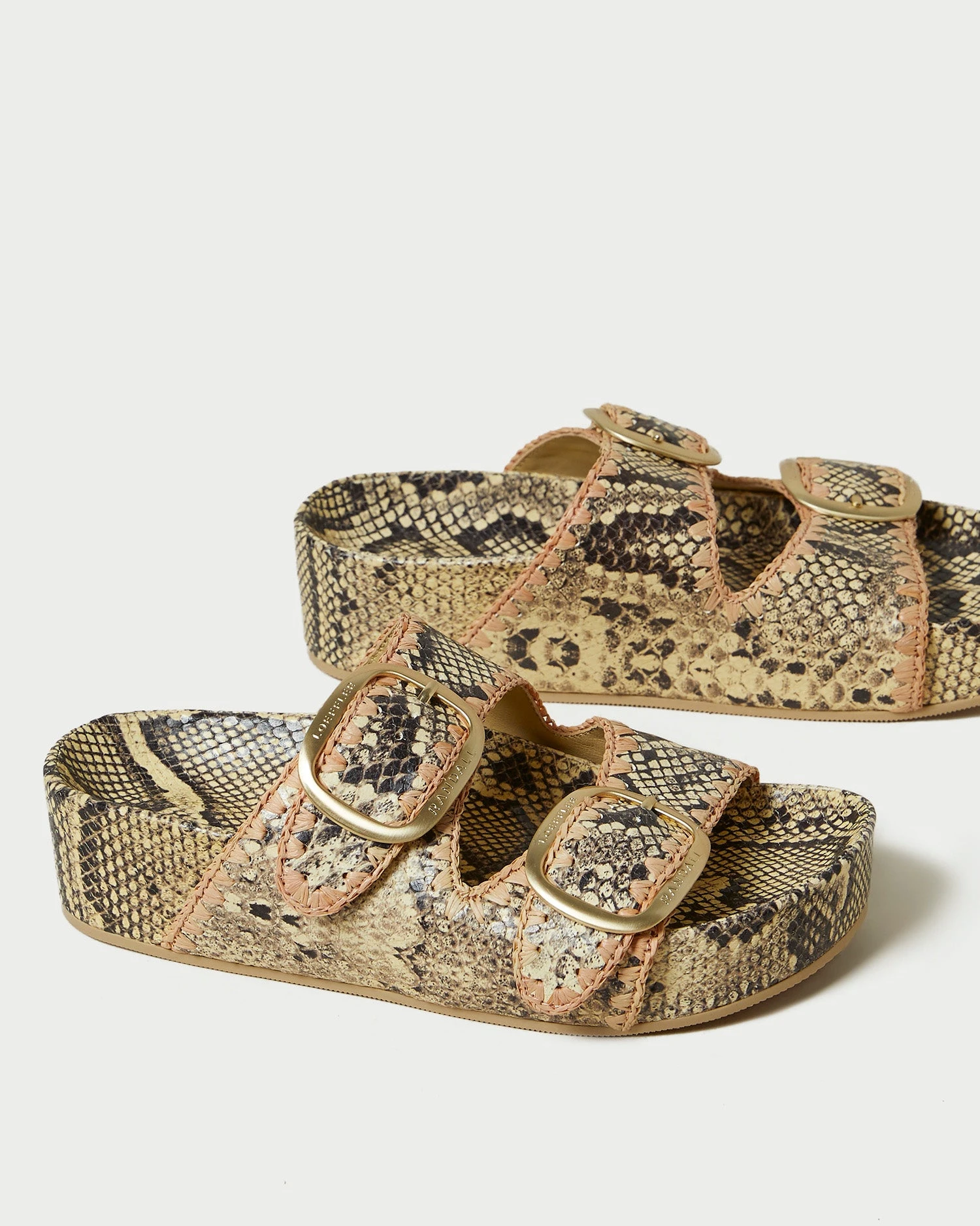 Two-band platform footbed sandal in bone snake-embossed leather with pink raffia embroidered detailing. Features a padded leather footbed, an open toe, and a slip-on design. 1.5-inch platform.