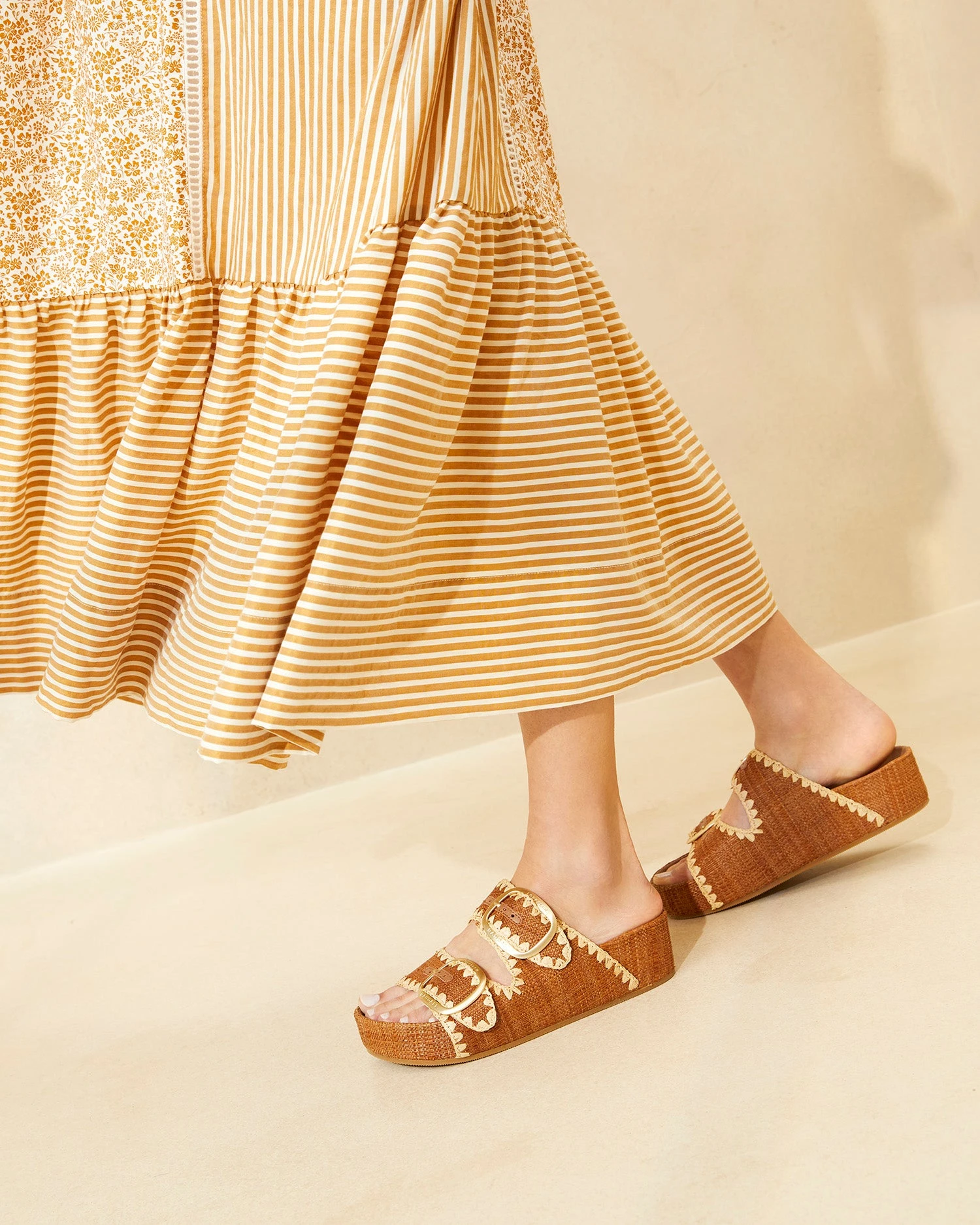 Two-band platform footbed sandal in brown raffia with natural raffia embroidered detailing. Features a padded leather footbed, an open toe, and a slip-on design. 1.5-inch platform.