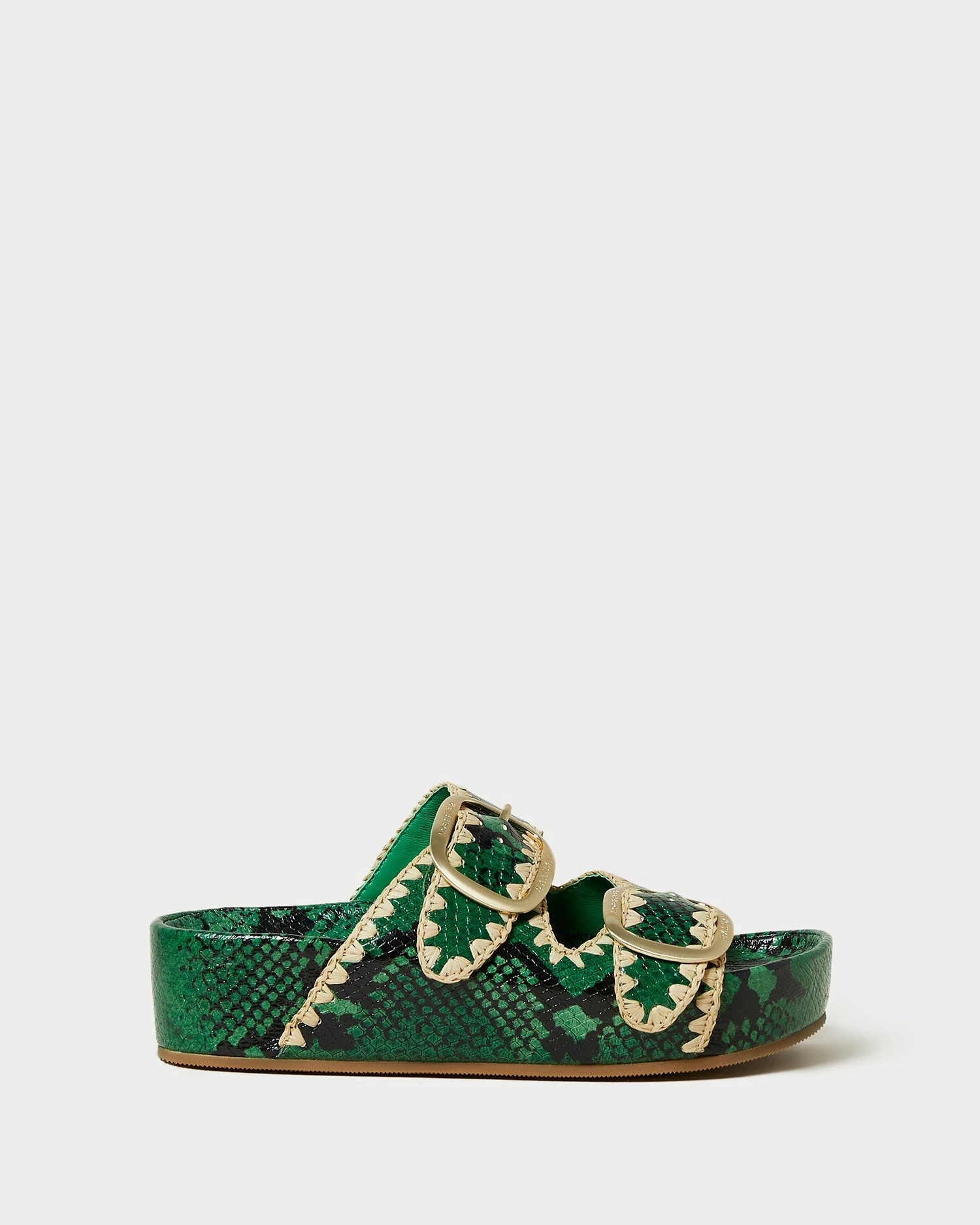 Two-band platform footbed sandal in green snake-embossed leather with natural raffia embroidered detailing. Features a padded leather footbed, an open toe, and a slip-on design. 1.5-inch platform.