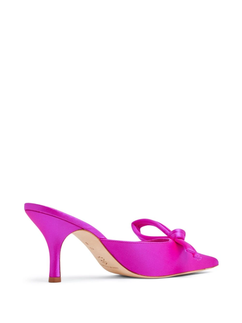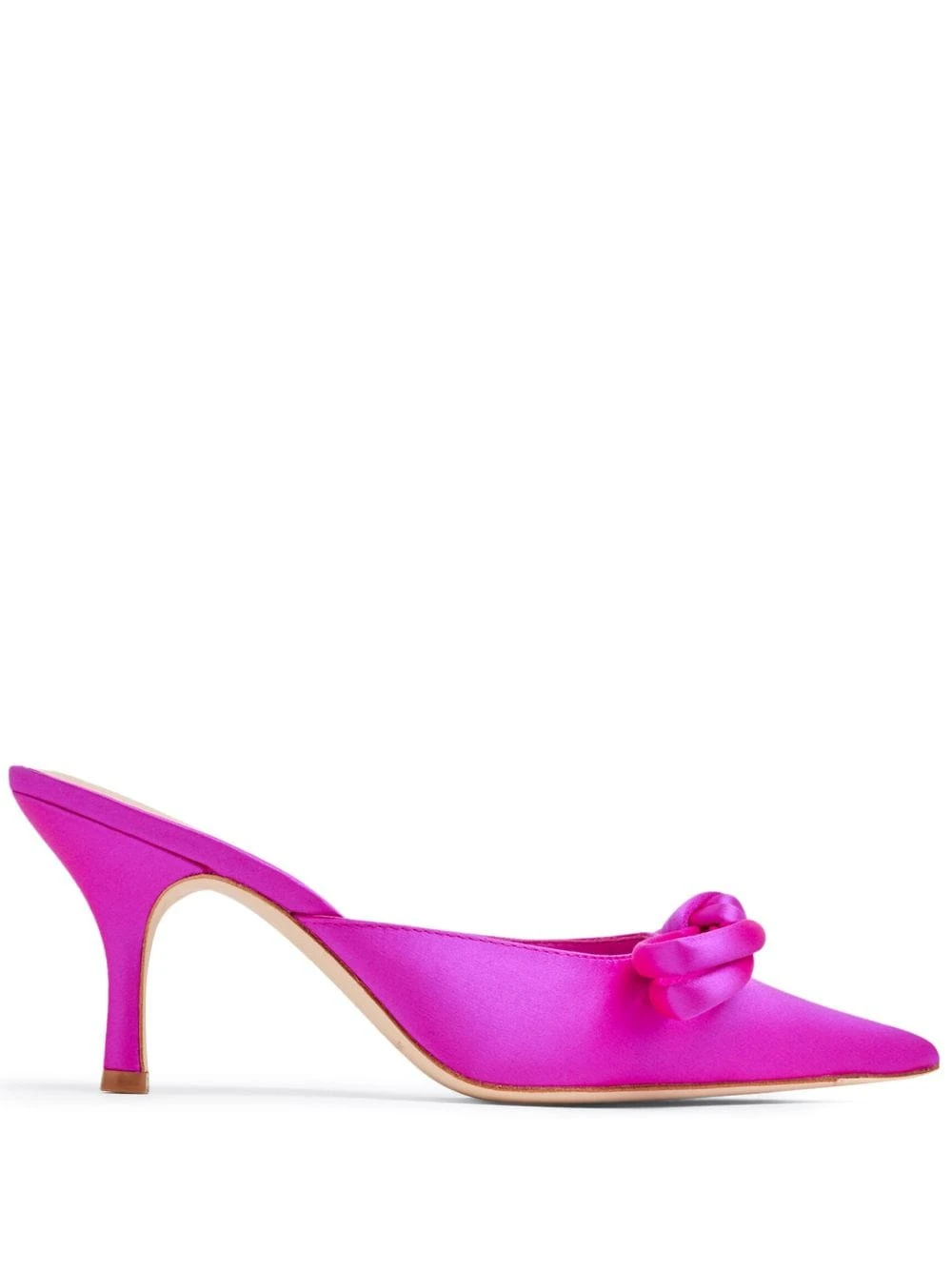 Amyra knot-detail satin mules from LOEFFLER RANDALL featuring fuchsia pink, calf leather, satin finish, knot detailing, pointed toe, open back, branded footbed and kitten heel. We’ve partnered with Good On You — an independent agency that rates how brands perform in relation to their impact on the planet, people and animals, with a multi-criteria rating simplified to a five points scale. In order to be awarded our conscious label, larger brands need to score a minimum of four out of five (‘Good’), while smaller brands must score at least three out of five (‘It’s A Start’). This item comes from a brand rated three out of five (‘It’s A Start’) by Good on You. Please note, this is a brand-level rating and does not guarantee that this product is made with conscious materials.. Learn more about what makes a product Conscious on our Conscious Criteria page.