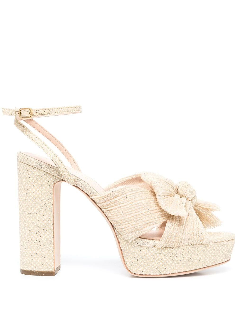 Natalia platfrom bow sandals from LOEFFLER RANDALL featuring cream, glitter detailing, bow detailing, pleat detailing, branded leather insole, buckle-fastening ankle strap, open toe, platform sole and 115mm block heel.